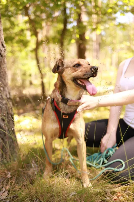 Ładnie i spokojnie chodzić na smyczy, na spacerze jest cały czas w kontakcie z człowiekiem.