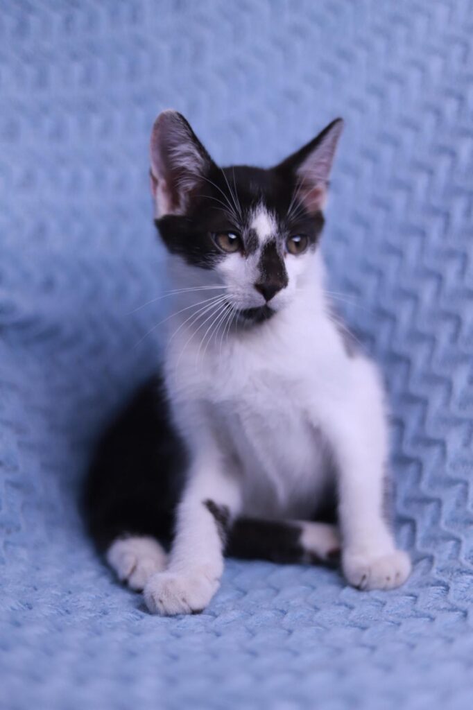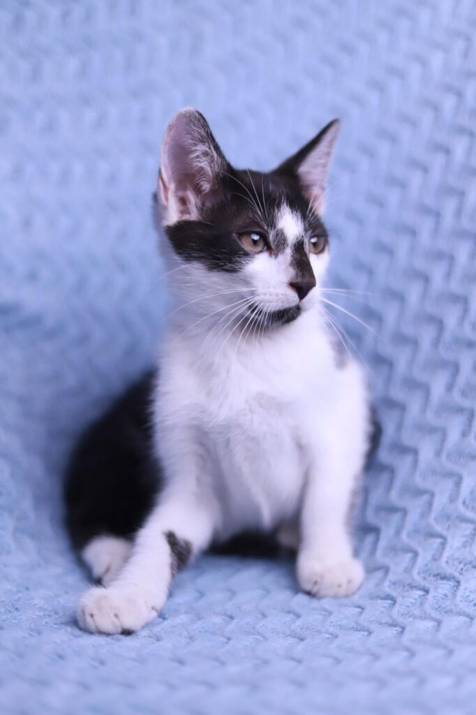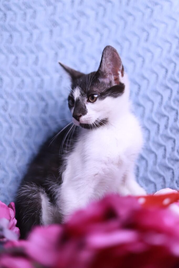 Ten 7-miesięczny biało-czarny kociak to prawdziwy wulkan energii i uroczy rozrabiaka. Ma w sobie wszystko, co kochamy w małych kotkach – ciekawość, radość i mruczące serduszko, które szybko podbija każde serce.
